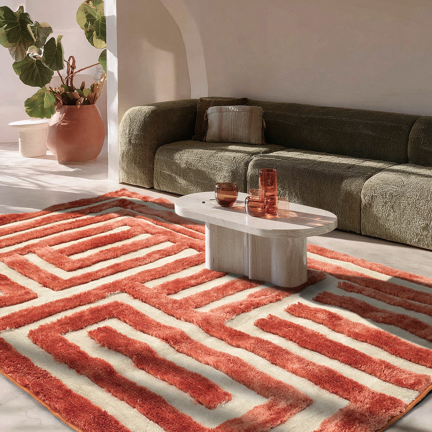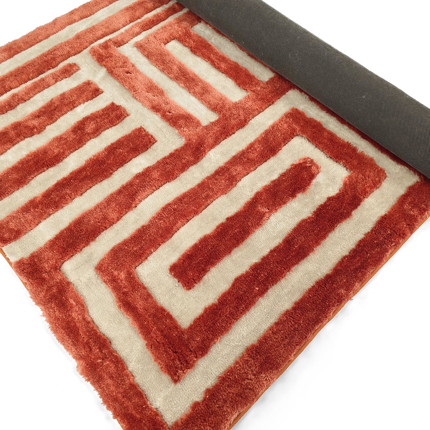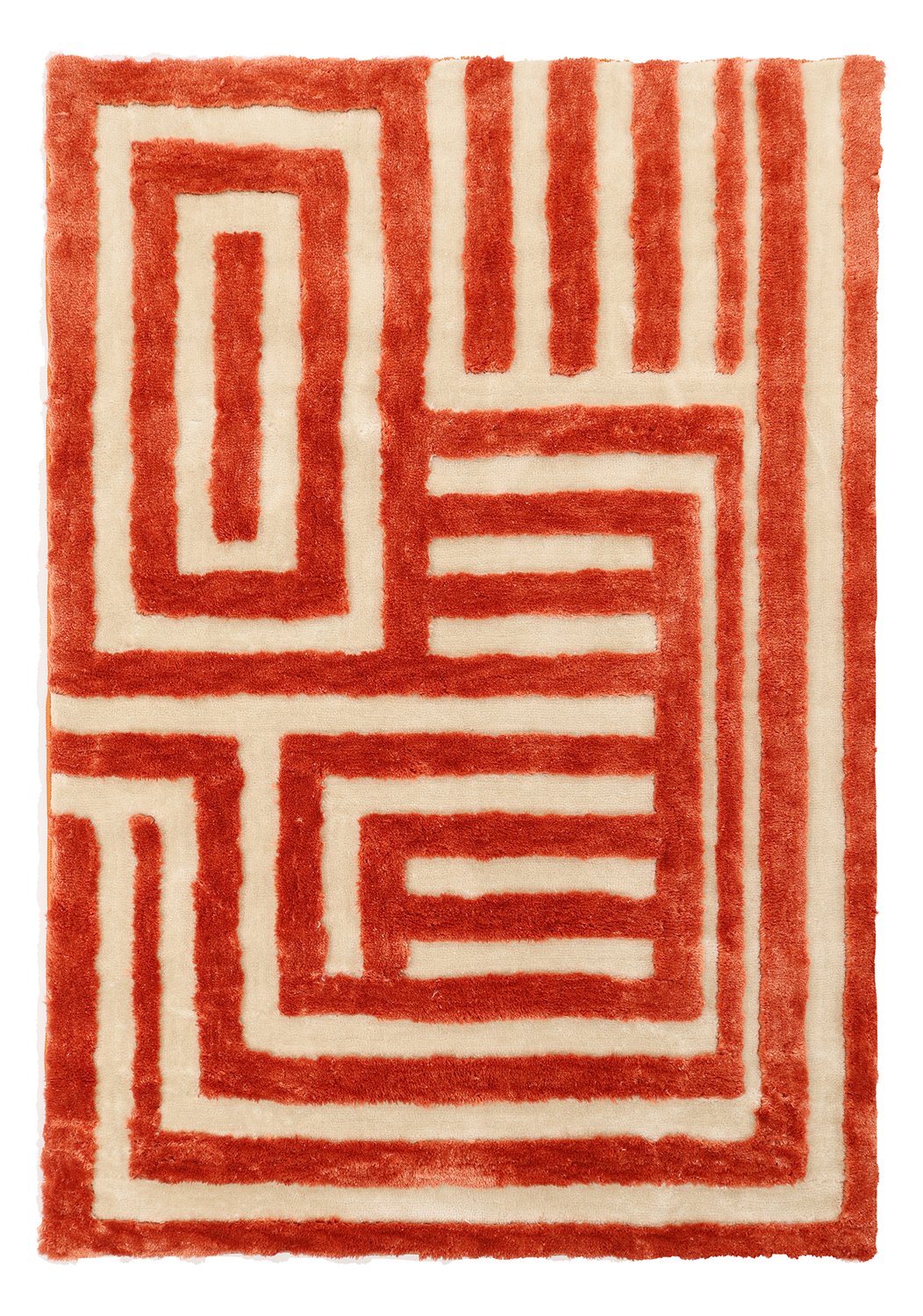 Elegante tapete de pelo alto com estrutura high and low que cria uma sensação moderna e dinâmica no ambiente. O tapete tem uma pilha de alturas variadas, proporcionando uma superfície tátil e um belo jogo de profundidade à luz. A pilha espessa torna o tapete macio e confortável ao caminhar, enquanto as partes mais baixas realçam o padrão e dão um toque exclusivo.