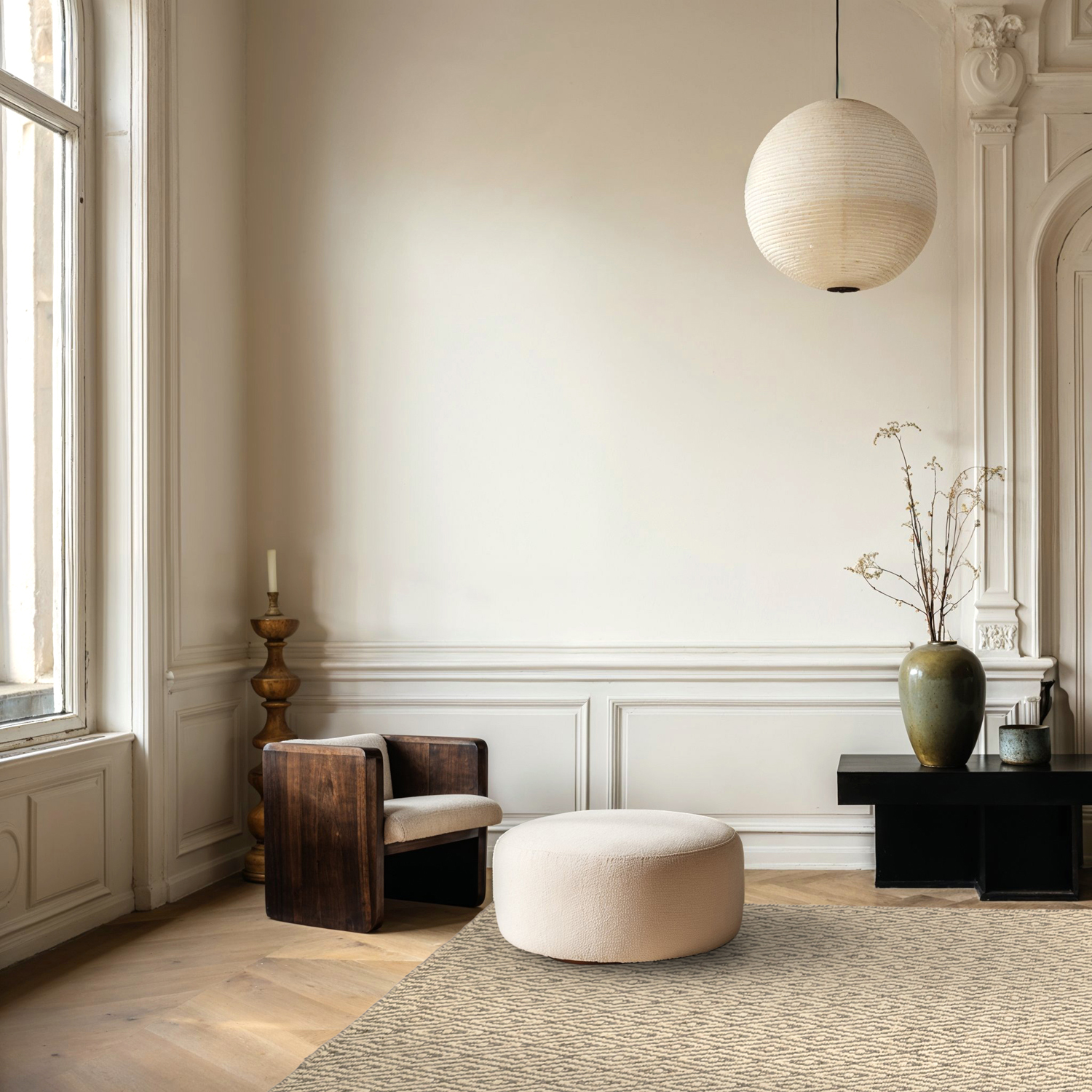 Um tapete de lã de tecelagem plana que combina elegância natural com simplicidade moderna. A tecelagem densa cria uma superfície durável e estável, perfeita tanto para a sala de estar como para debaixo da mesa de jantar. Graças ao perfil baixo, o tapete é fácil de manter e prático, acrescentando calor e textura ao ambiente. Um tapete de lã elegante que traz um toque harmonioso e sofisticado à sua casa.